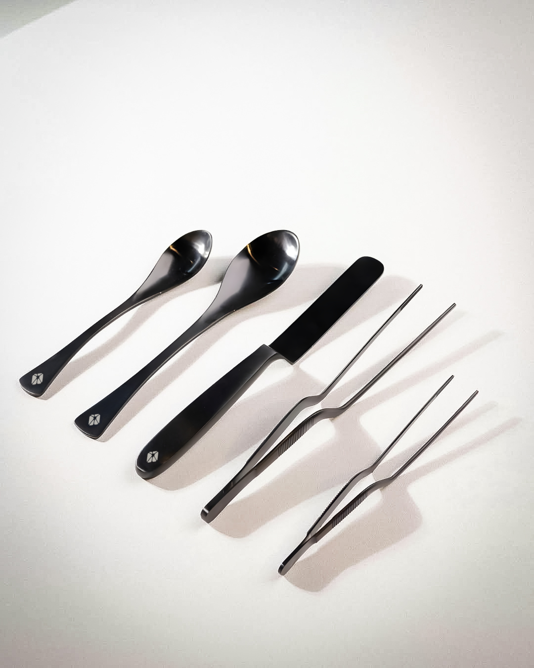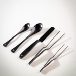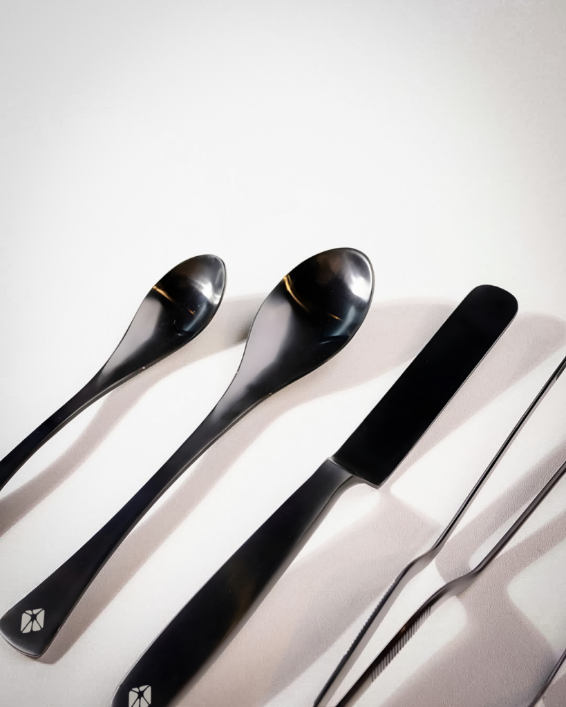 Descubra nuestra colección premium de utensilios de cocina metálicos de alta calidad, que incluyen una espátula versátil, dos cucharas quenelle y dos pinzas. Cada artículo, cuidadosamente empaquetado en una funda, lleva el logotipo de confianza de MoldBrothers.