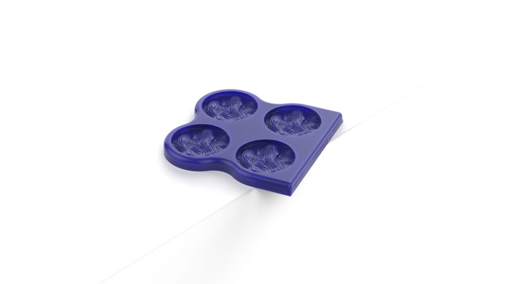 Moule en silicone de haute qualité ayant la forme d'un disque circulaire topographique texturé. Le moule comporte quatre cavités et est fabriqué en silicone alimentaire 100%.