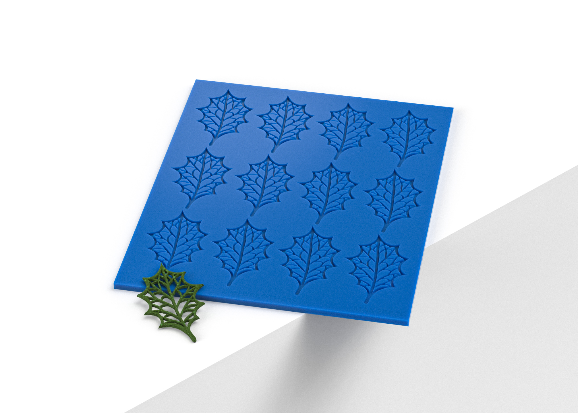 Un moule en silicone de haute qualité contenant des formes de feuilles de houx. Le moule comporte douze formes et est fabriqué en silicone alimentaire 100%. Ce moule est capable de résister à des températures allant de -40°C à +200°C, ce qui permet de l'utiliser aussi bien dans les congélateurs (chocs) que dans les fours.