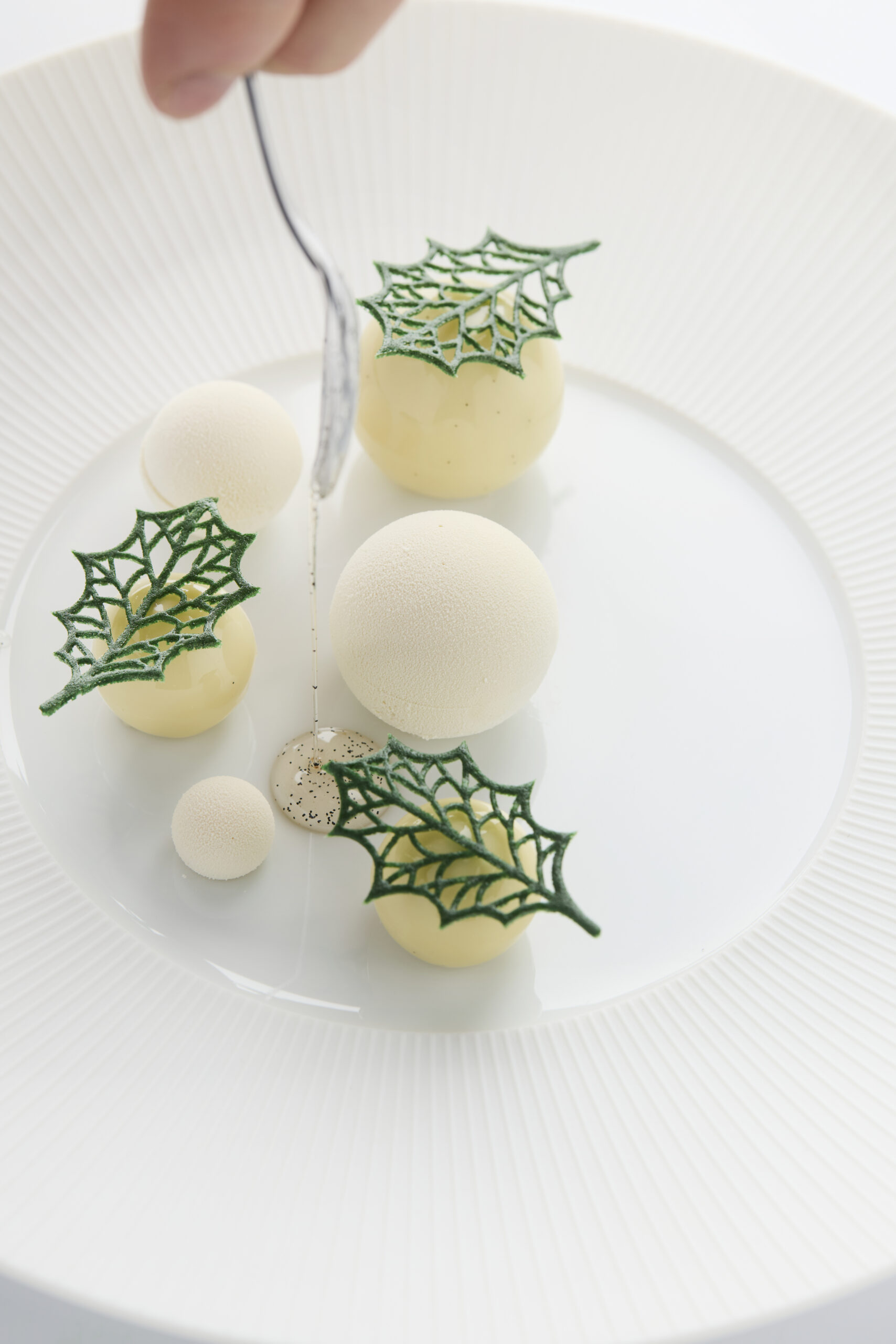 A light, crisp interpretation of the holly leaf. The Holly Leaf Tuille Mold creates fine, open shapes that add a festive accent and subtle texture to your dessert or dish. It is a minimal yet recognizable way to bring the season onto your menu, a small nod to the warmth and calm of winter days. For an extra touch, add a small red gel dot to imitate the classic holly berries.